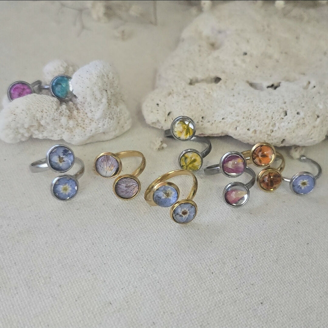Add a touch of nature to your style with these delicate adjustable flower rings. Crafted from gold or silver-plated brass, copper, or steel, each ring features charming floral accents and an easy adjustable fit for everyday comfort. A simple, timeless piece that’s perfect for layering or wearing on its own.