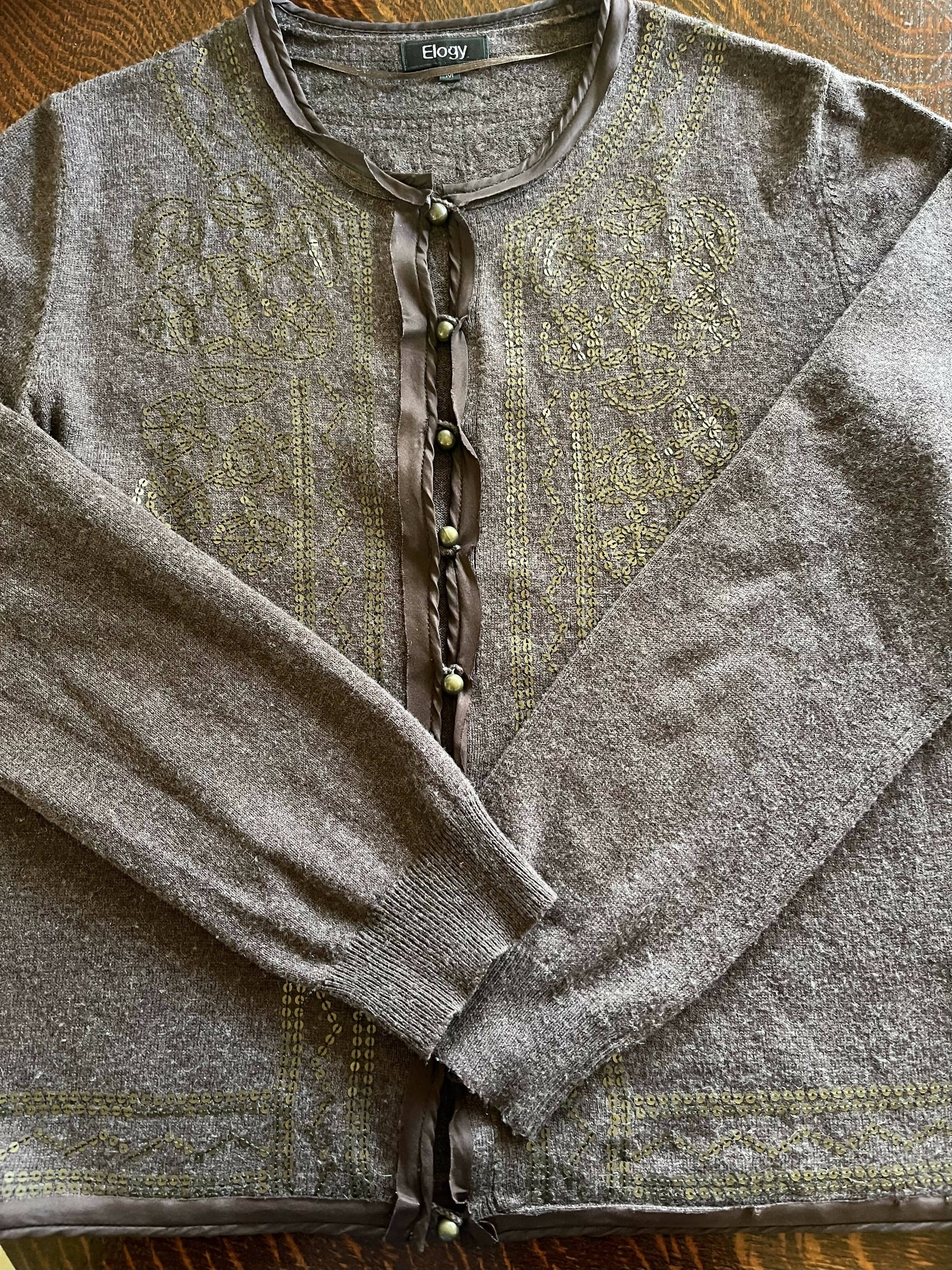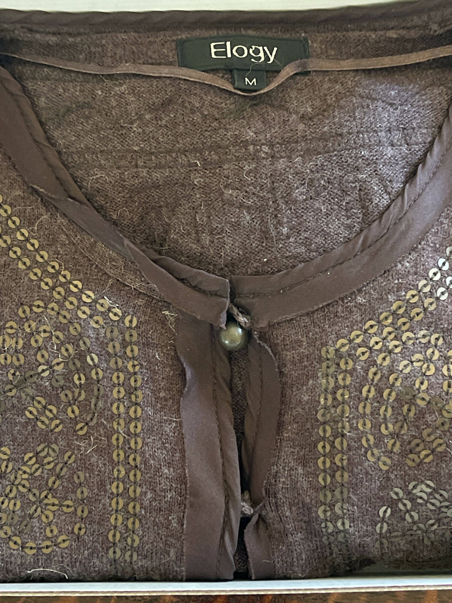 - a very cool preloved cardigan sweater in chocolate brown by Elogy. It's made in Madrid, Spain which makes even more cool! The cozy sweater, which has subtle brown sequins sewn in the front, is made with viscose, cotton, wool, acrylic and alpaca. Size medium. This is a pre-loved sweater and does show some slight signs of wear on the sleeves. (value $40)