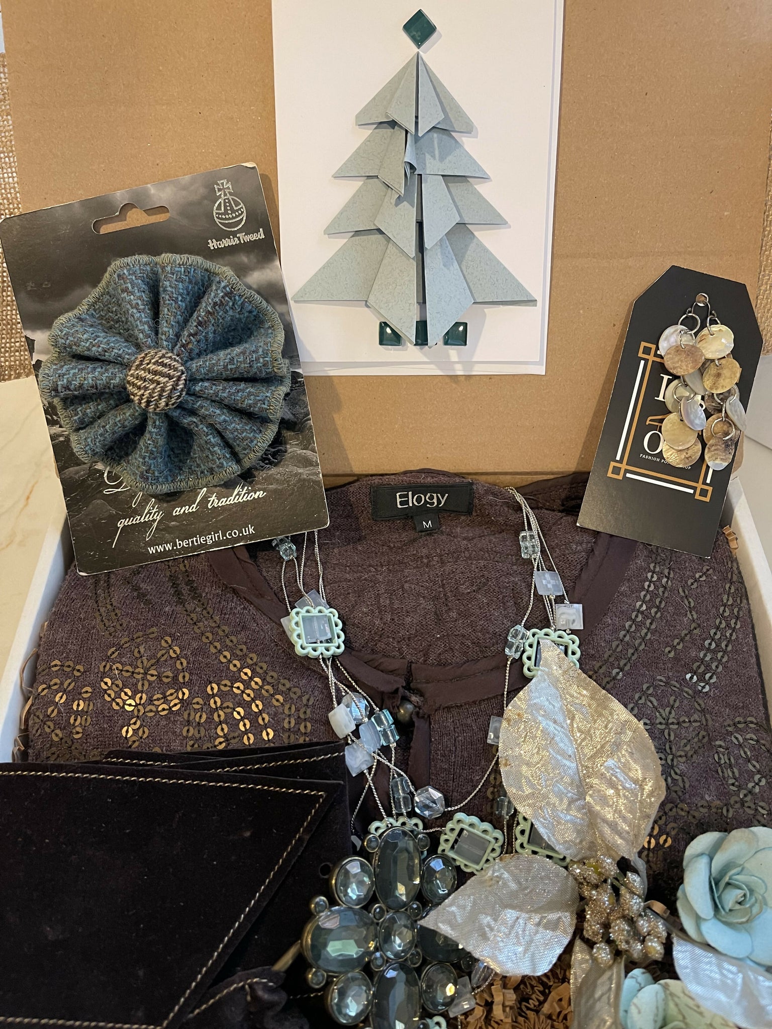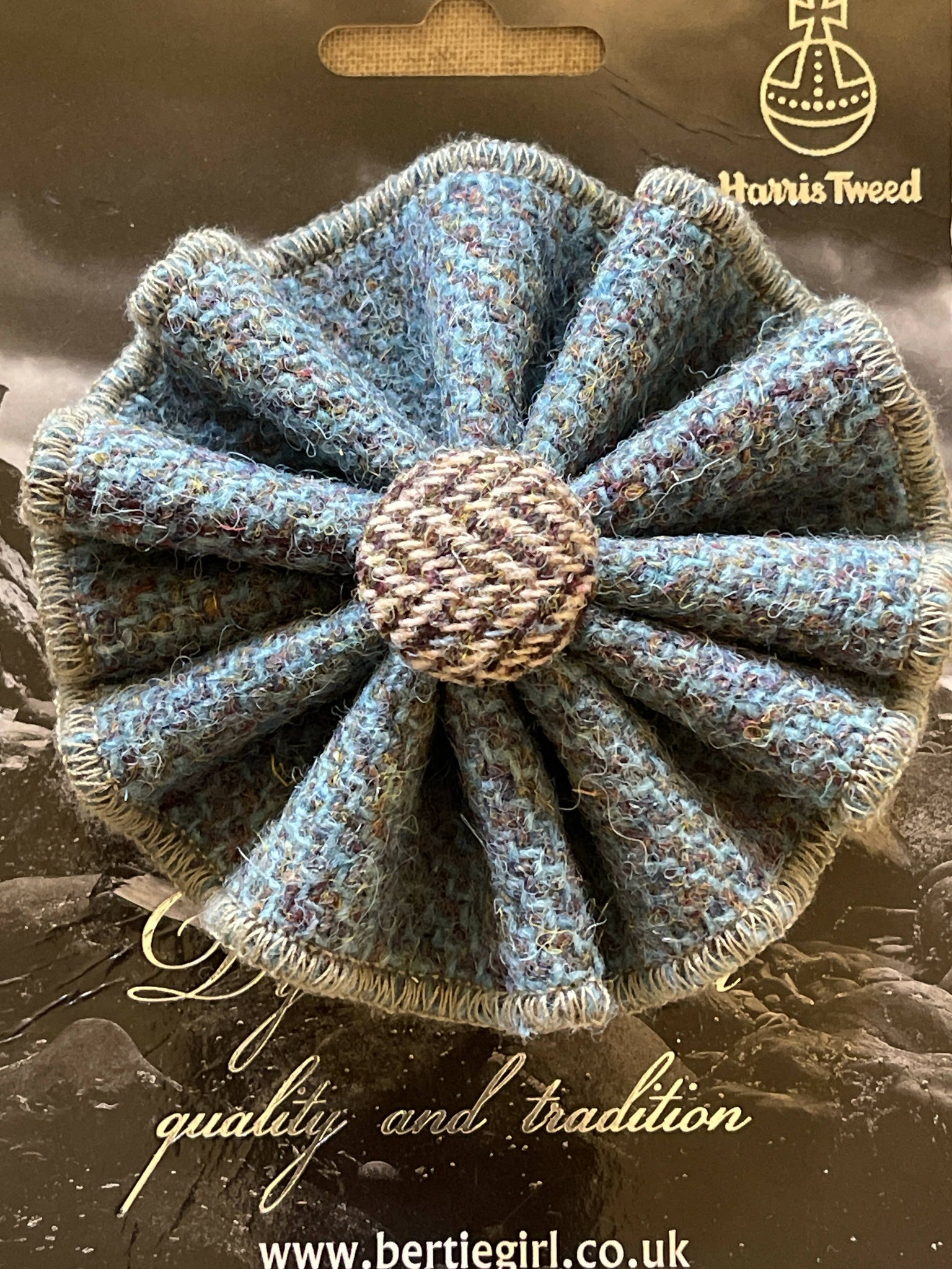 * - a fun brown & teal 100% Harris Tweed wool brooch, handmade in Scotland. Use to adorn a jacket, top, skirt, hat or scarf. The possibilities are limitless! This rosette shaped pin is finished by expert sewers who neatly and precisely fold the tweed like they would a kilt to create this unique shape. Handmade in Scotland. (retails for $35)