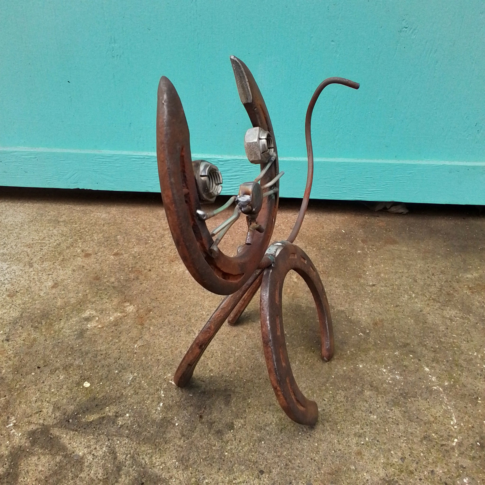 The Cat is made with recycled vintage horseshoes, and misc metal. Each piece of metal is hand selected for shape and character, no two are alike. It is designed, crafted and welded by the artist using recycled materials. This whimsical piece would be a wonderful gift or a great addition to a porch, garden or entryway.