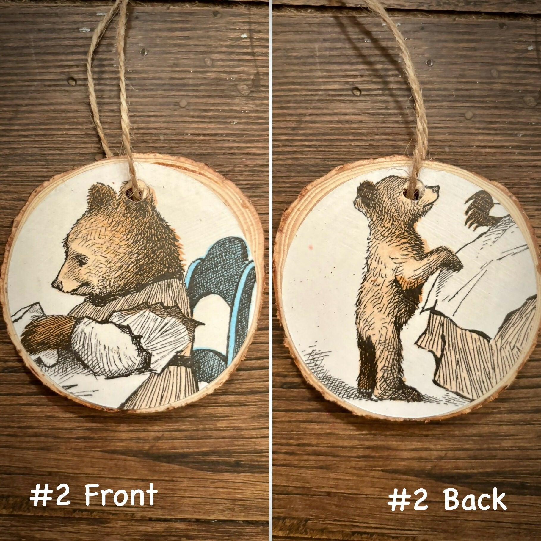 Round wood-cut ornament featuring recycled vintage images from second-hand children’s books. Double-sided with image on front and back (see photos). Each ornament measures approximately 2.5-3” in diameter, on twine string.