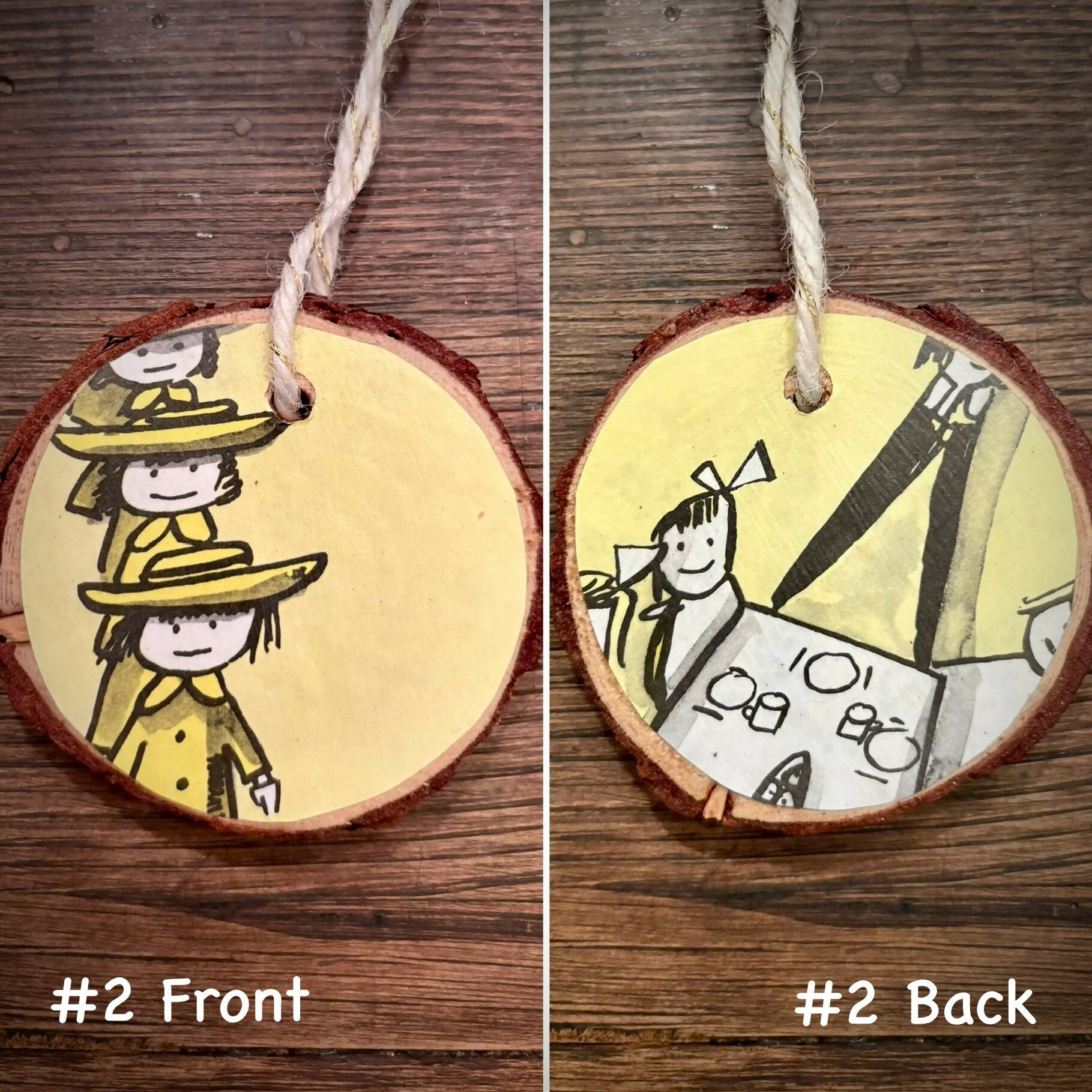 Round wood-cut ornament featuring recycled vintage images from second-hand children’s books. Double-sided with image on front and back (see photos). Each ornament measures approximately 2.5-3” in diameter, on twine string.