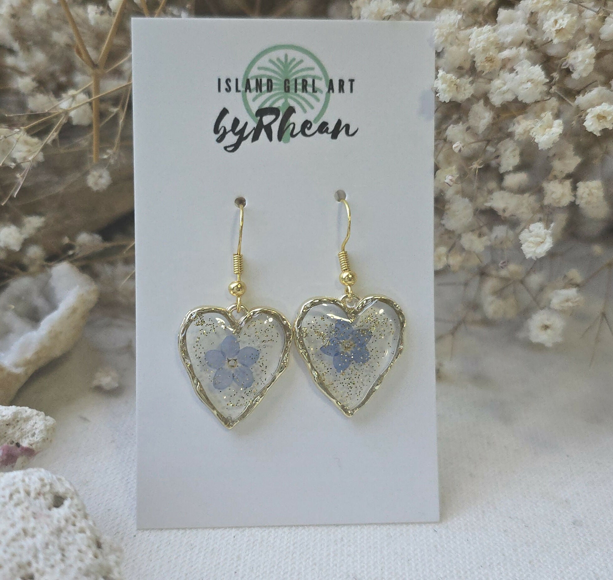 Components: Pressed flowers and plated gold and sterling silver or surgical steel components. All components lead, nickel and cadmium free.