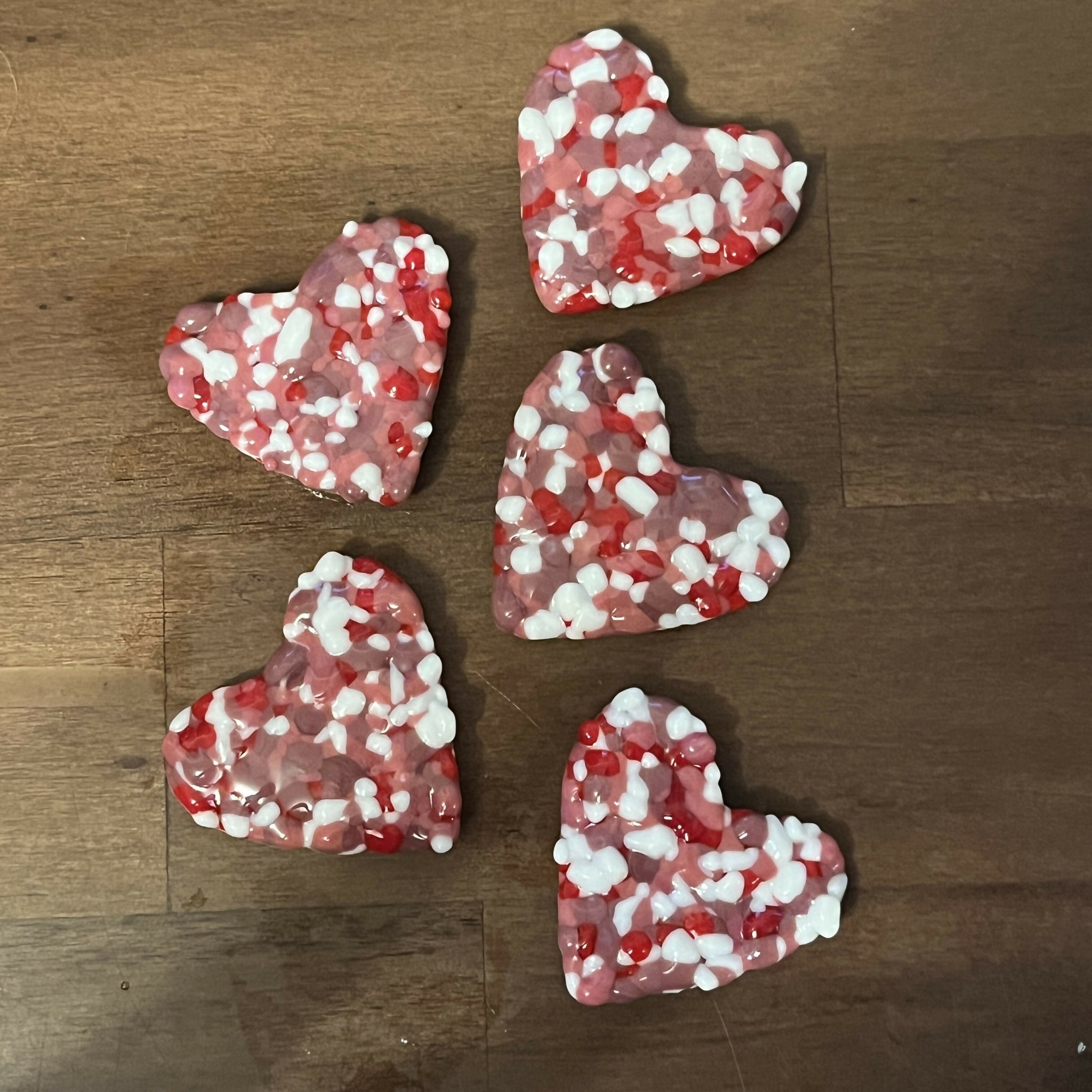 Delight your valentine with a glass heart in pinks, reds and purples. This heart is the perfect size to slip in your pocket. Smooth or textured it’s a great fidget toy as well. Made from fused glass.