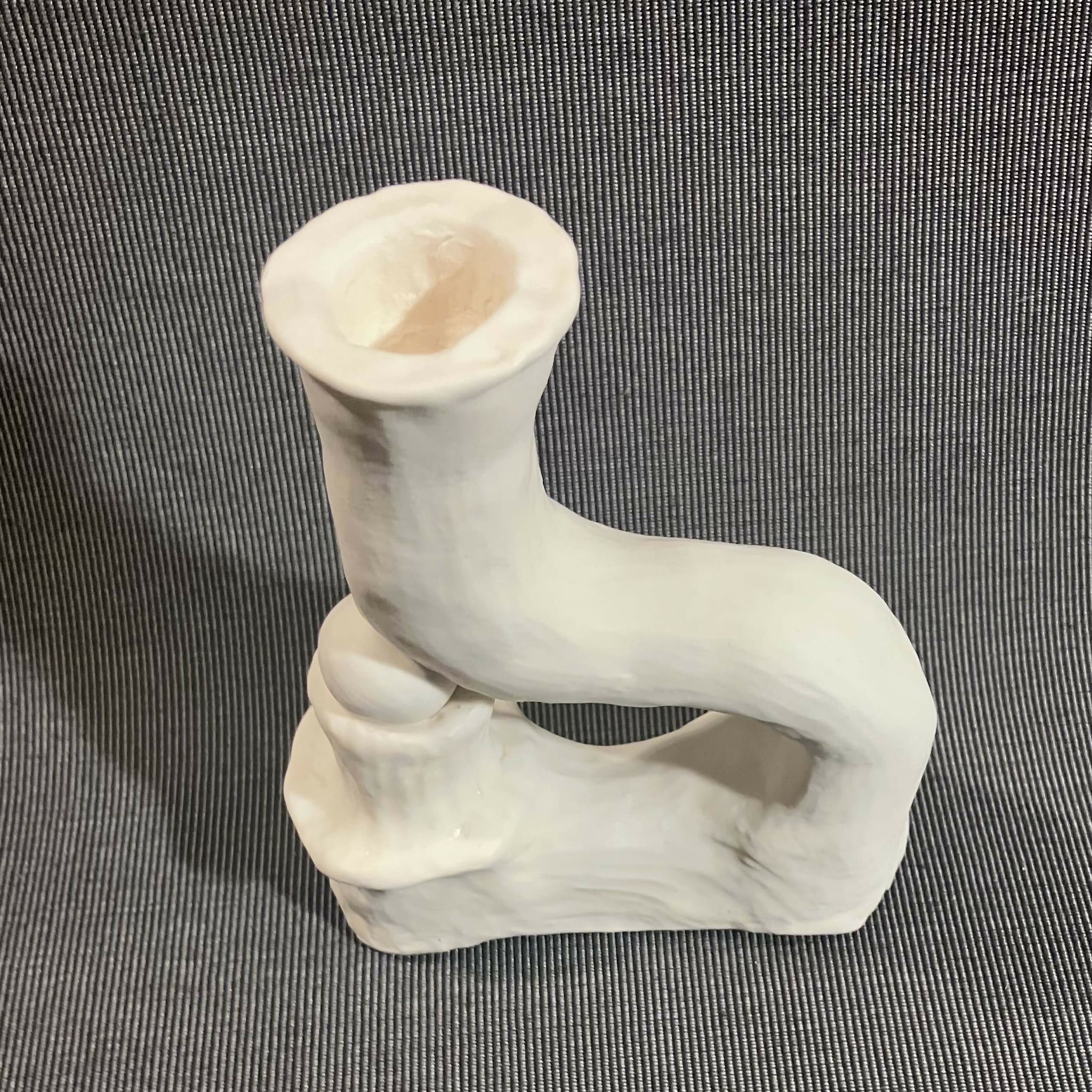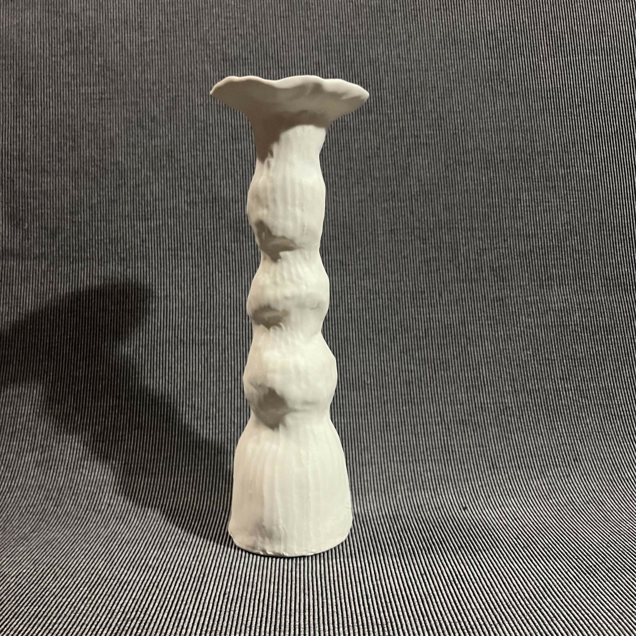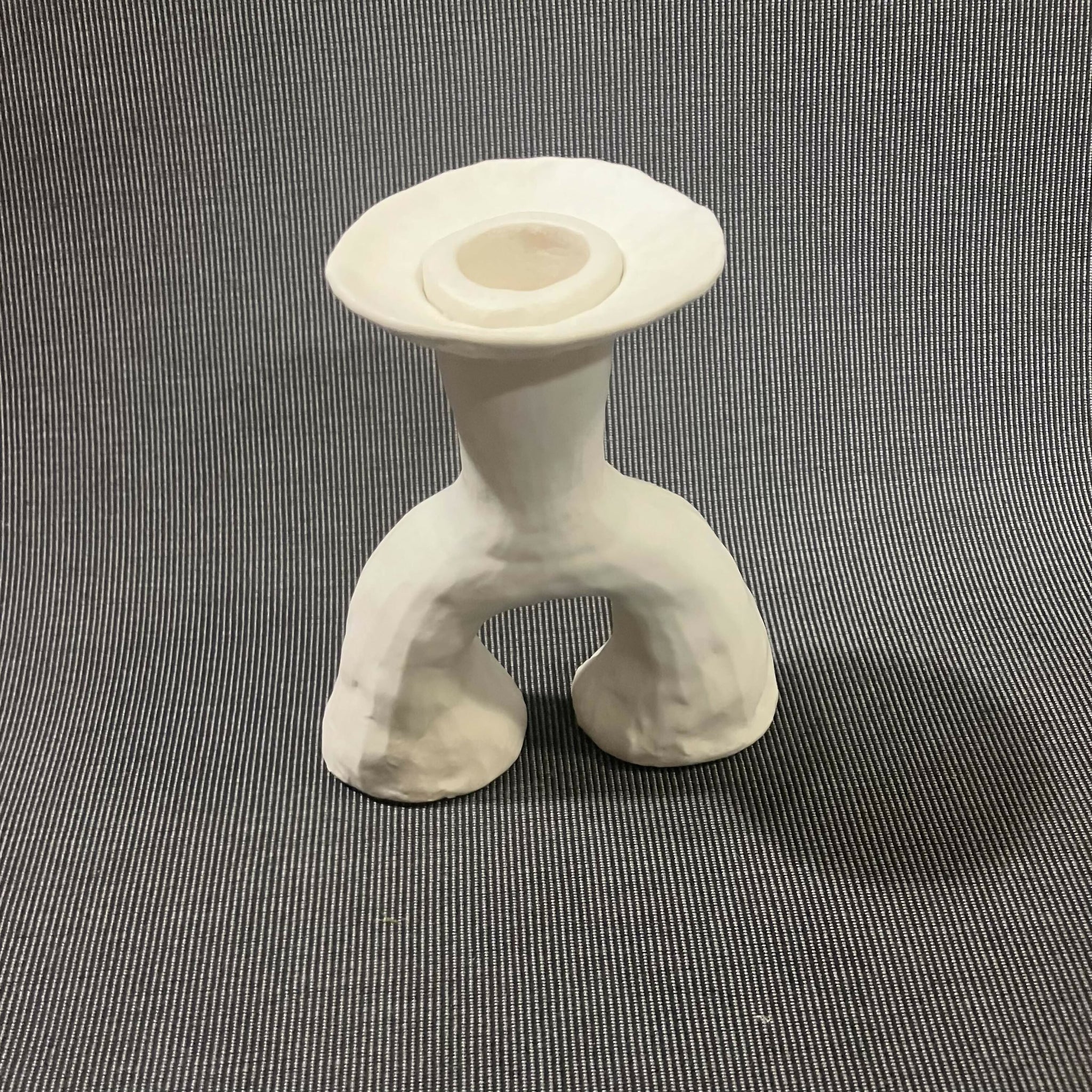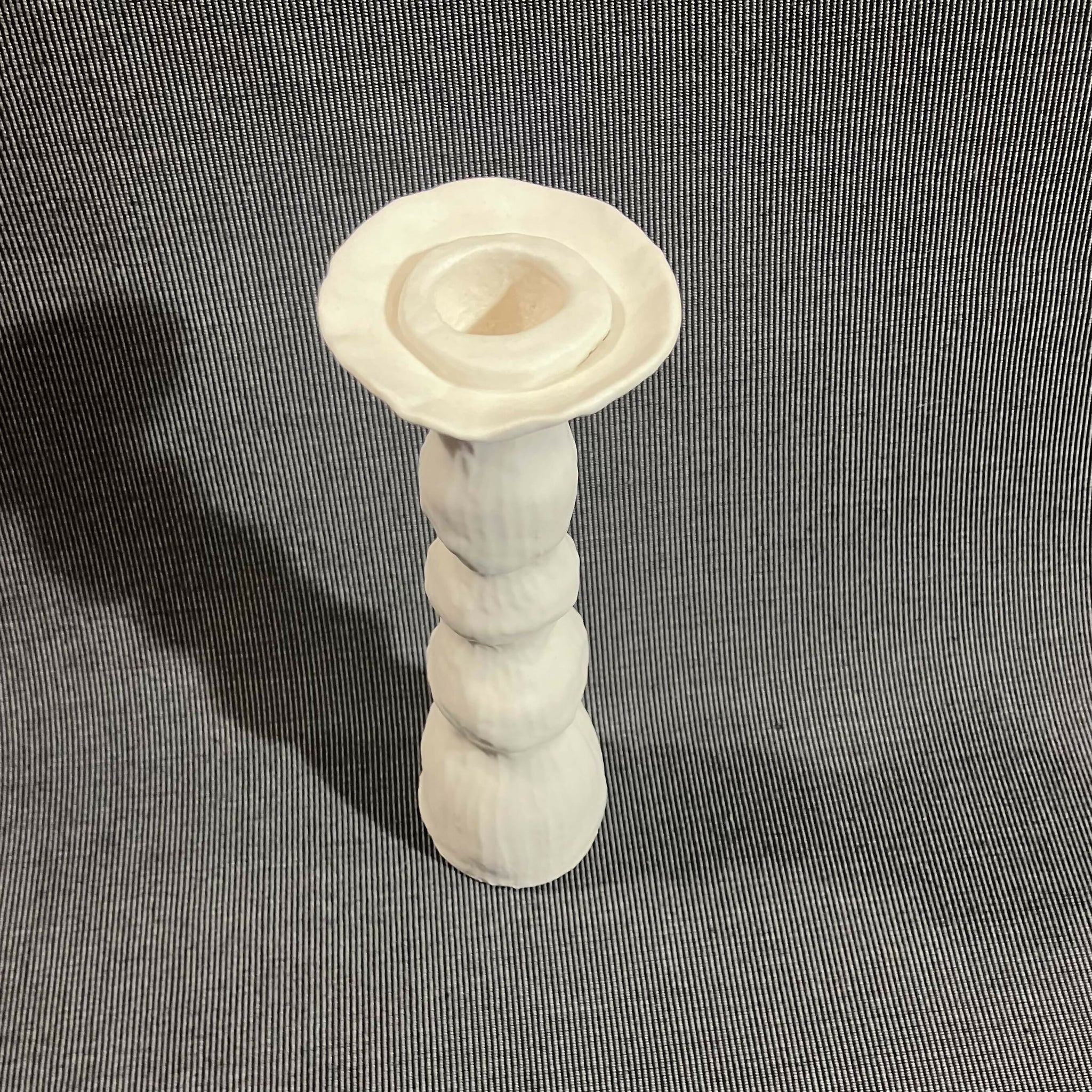 This hand made porcelain candlestick is one-of-a-kind. It is 6.5 inches tall, 4.5 inches wide, and 2 inches deep. The piece is glazed with a matte white glaze that adds a softness that encourages touch. I call my candlesticks "Still Life Candlesticks" because they inspire arrangements that are unique, artful, and worthy of a painting. Each candlestick will hold a typically sized candle taper.