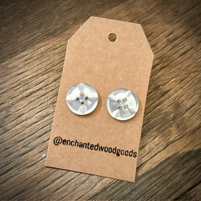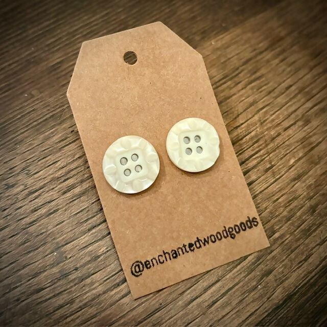 Handmade earrings made from upcycled/repurposed vintage and antique buttons carefully collected from travels throughout California and beyond. Stainless steel hypo-allergenic post and backing. Earrings measure approximately 9/16" in diameter.
