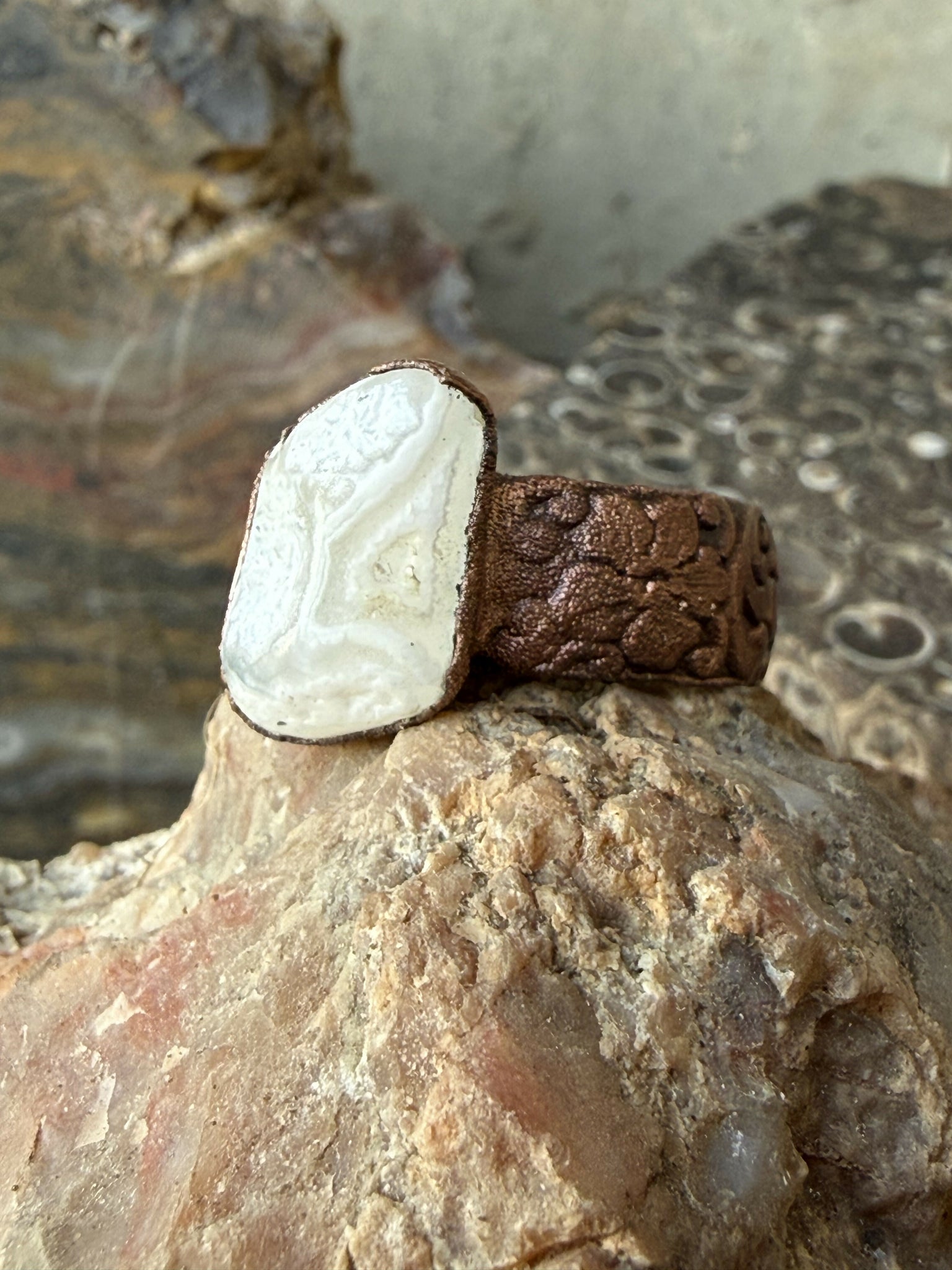 This cute little ring has a gorgeous white banded oil agate that was found right here in California. It has not been polished or altered in any way and is just how I found it. I felt there was no need to improve on what nature has made. It is set in solid reclaimed copper floral patterned band. This ring is a size 9