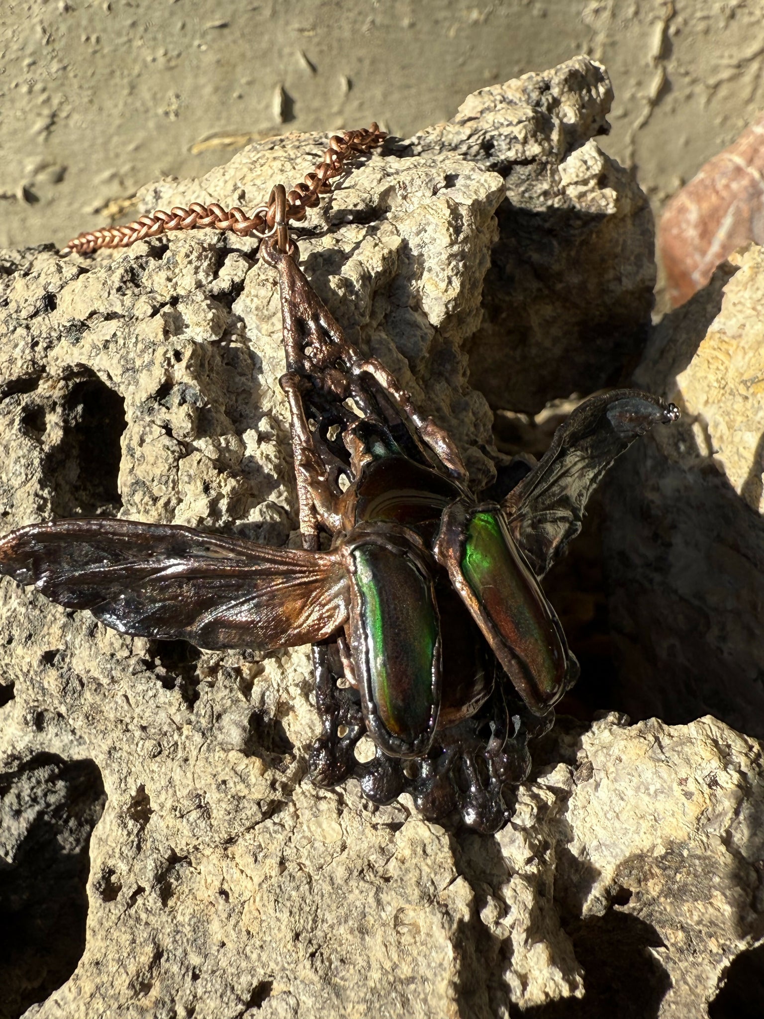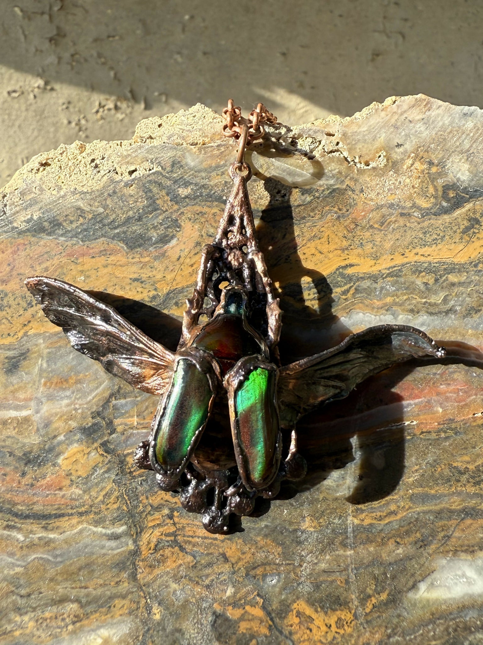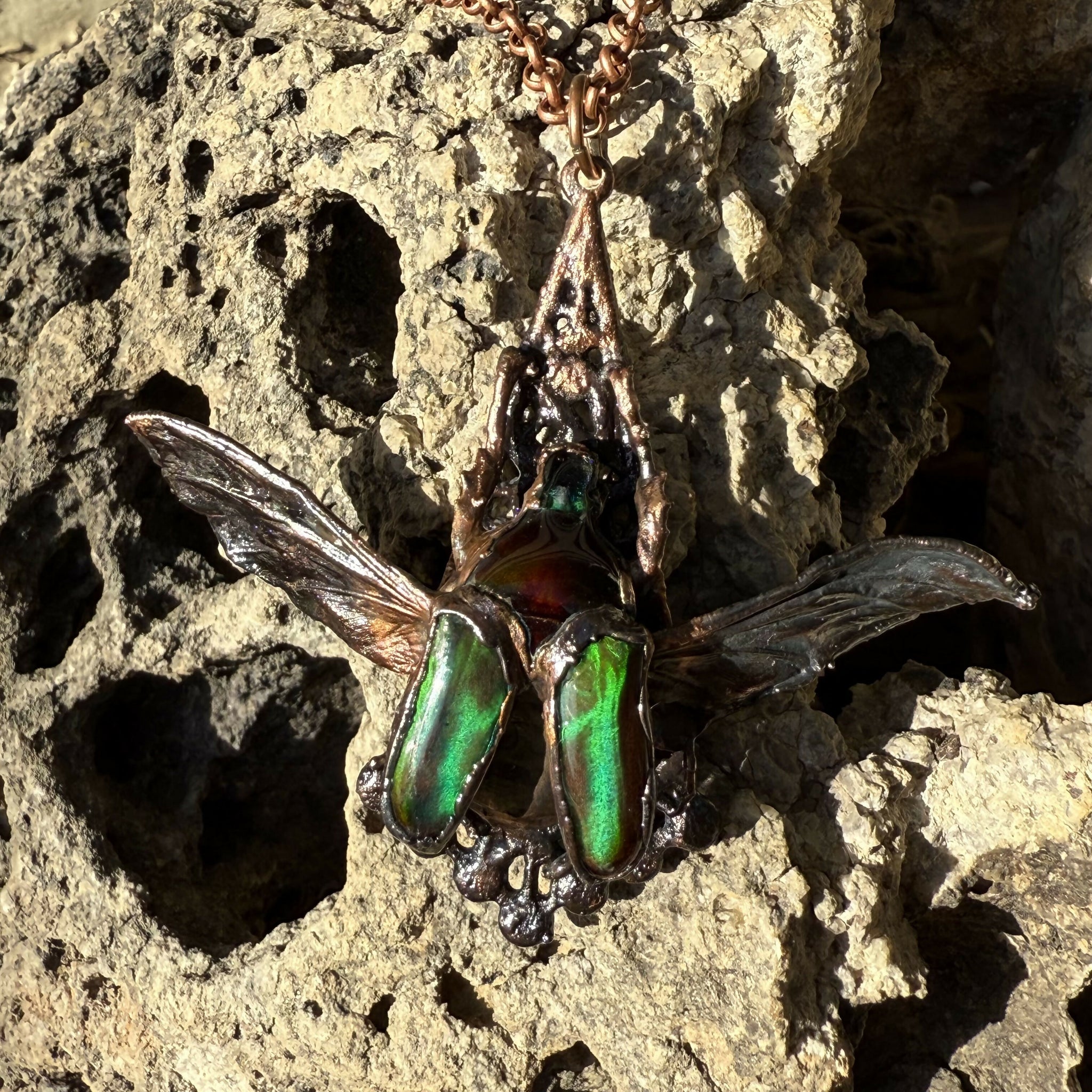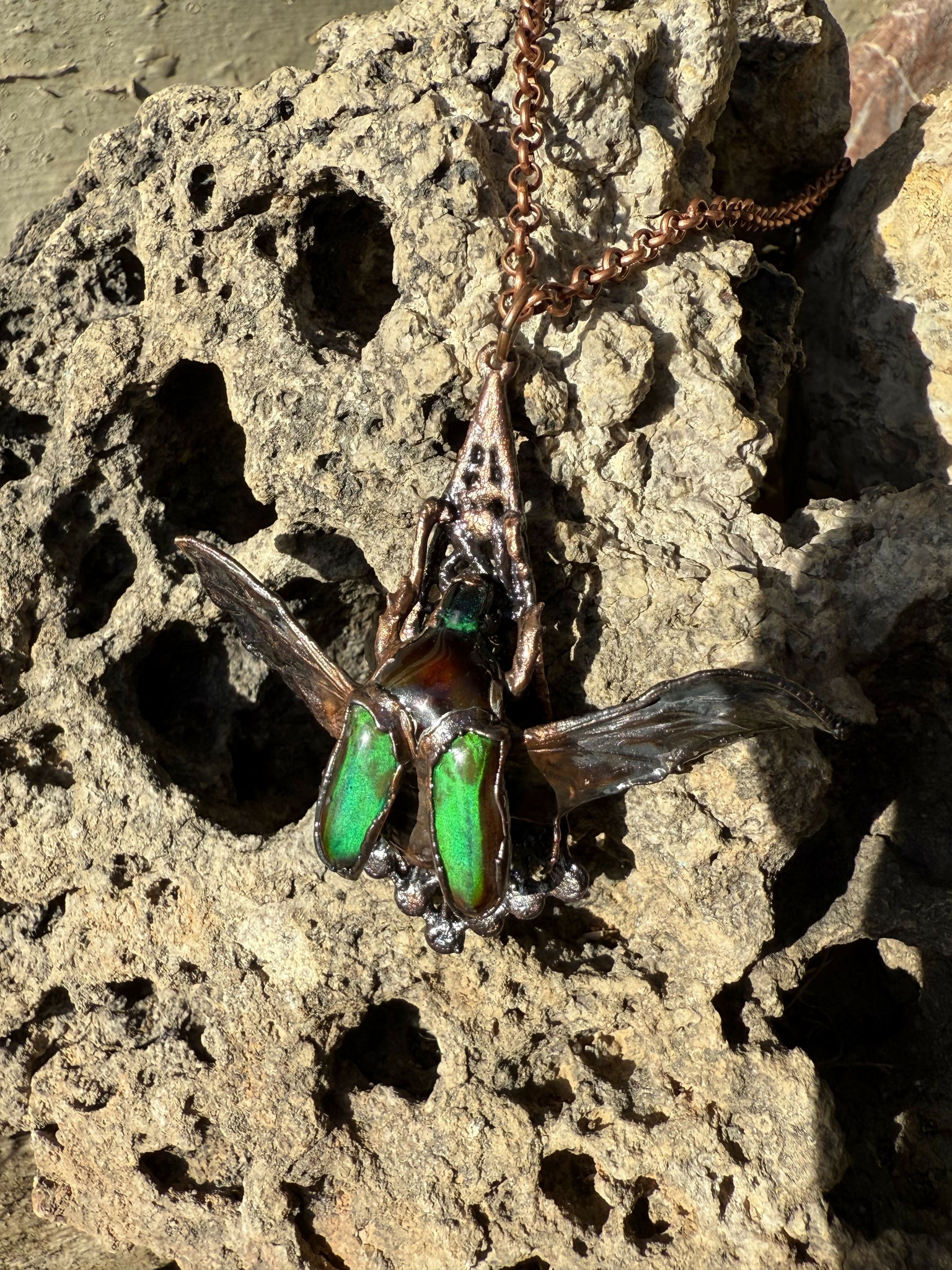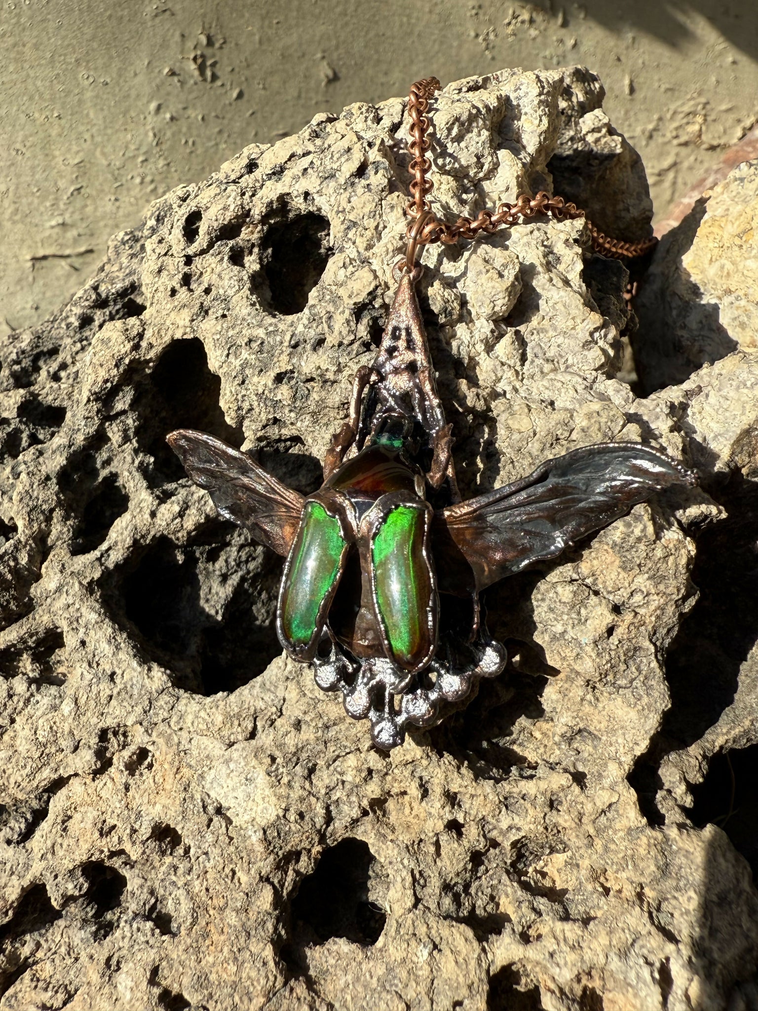 This one of a kind necklace is made using a real flower beetle. Its beautiful wing covers are a beautiful green that shifts to a red color when turned. Because of its natural beauty I’ve left the wings exposed. The remainder of the beetle has been copper electroformed to strengthen and preserve the insect. This gorgeous necklace is set on a 16 inch chain.
