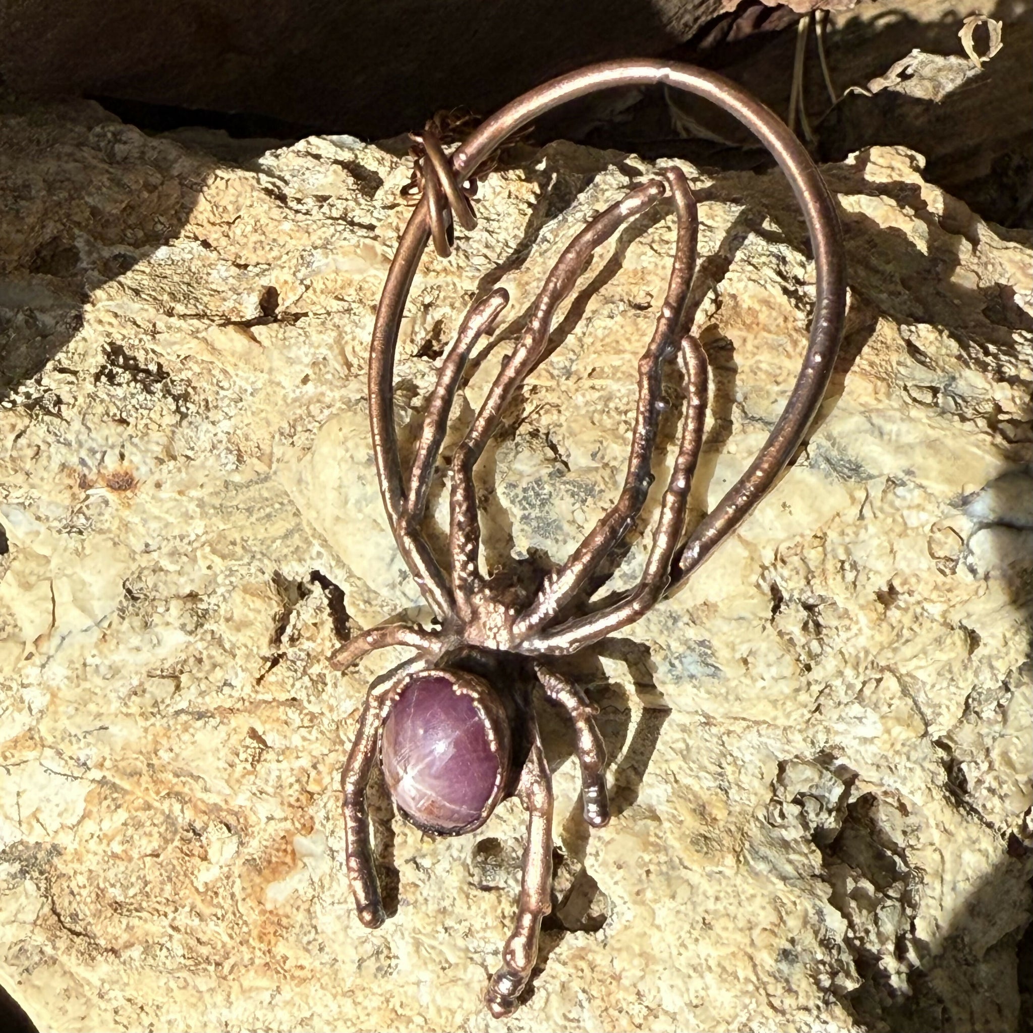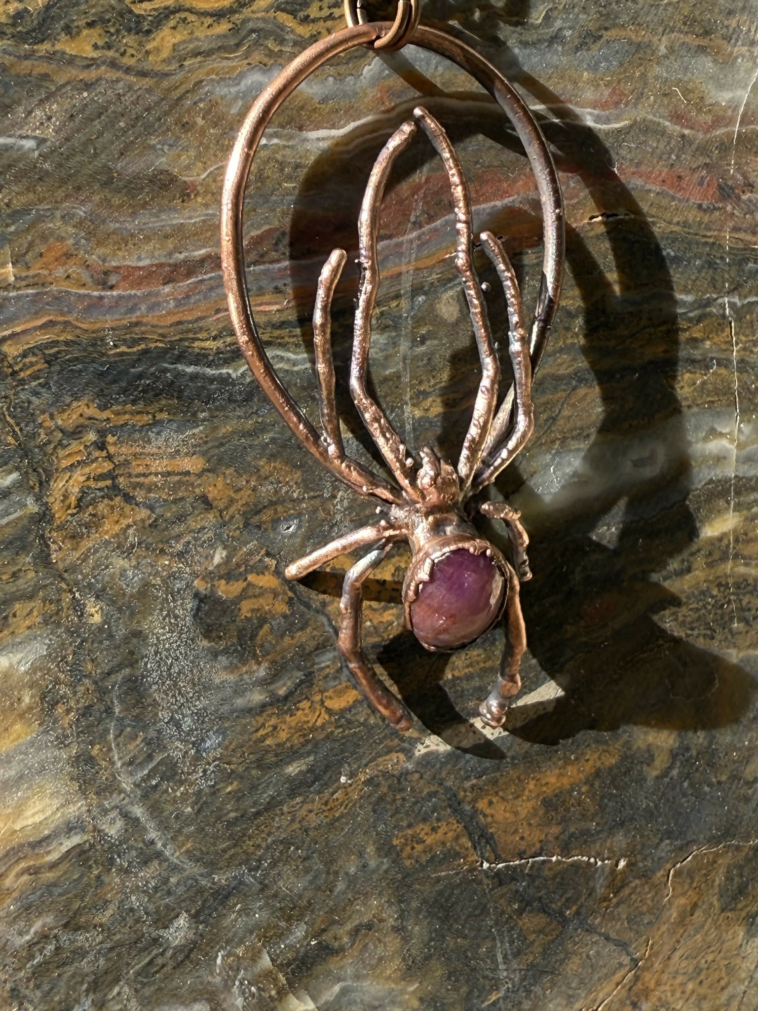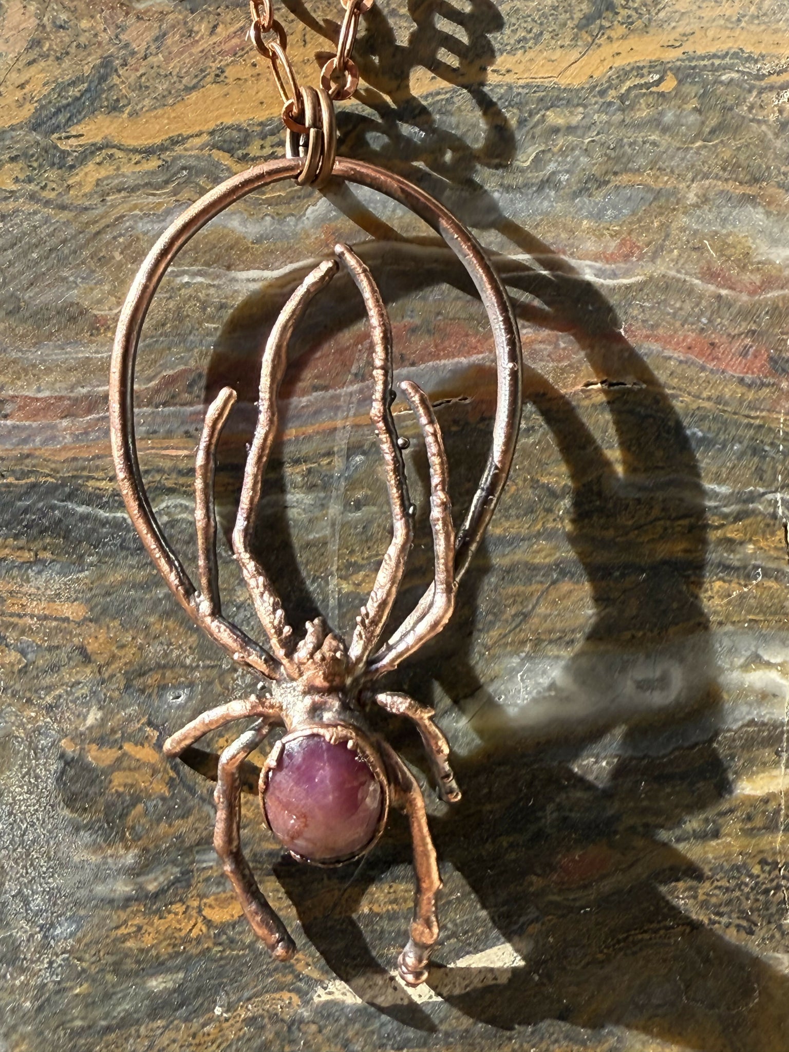This one of a kind necklace was created using a real garden spider and a star ruby. I’ve used the electroforming method to preserve the spider in a lovely layer of copper. Electroforming is a process of moving copper ions onto your desired piece allowing you to utilize items that wouldn’t be suitable for jewelry. This necklace is set on a beautiful 18 inch chain. This necklace would make the perfect accessory for the Halloween season!