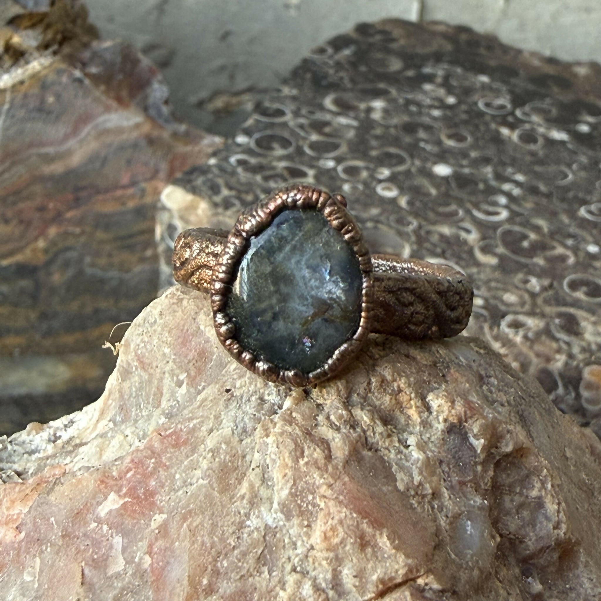 This unique ring was created using reclaimed copper and a hand polished natural blue sapphire. The stone has a lovely chatoyancy. This ring is a size 6 1/2