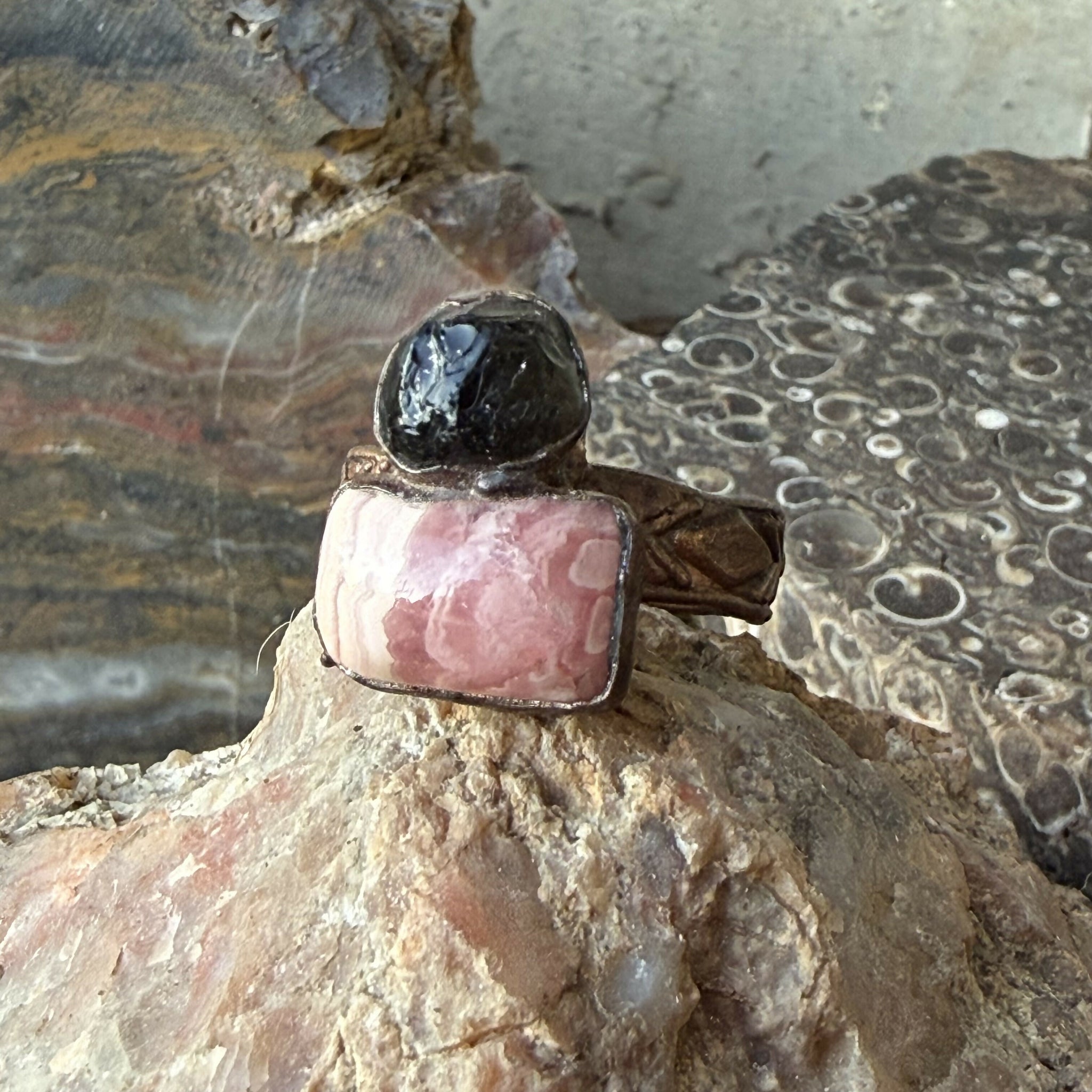 This ring is made using vibrant pink banded rhodonite stone and a natural obsidian nodule. It’s quite the statement piece! It has been set in solid reclaimed copper with a beautiful patterned band. This ring is a size 8