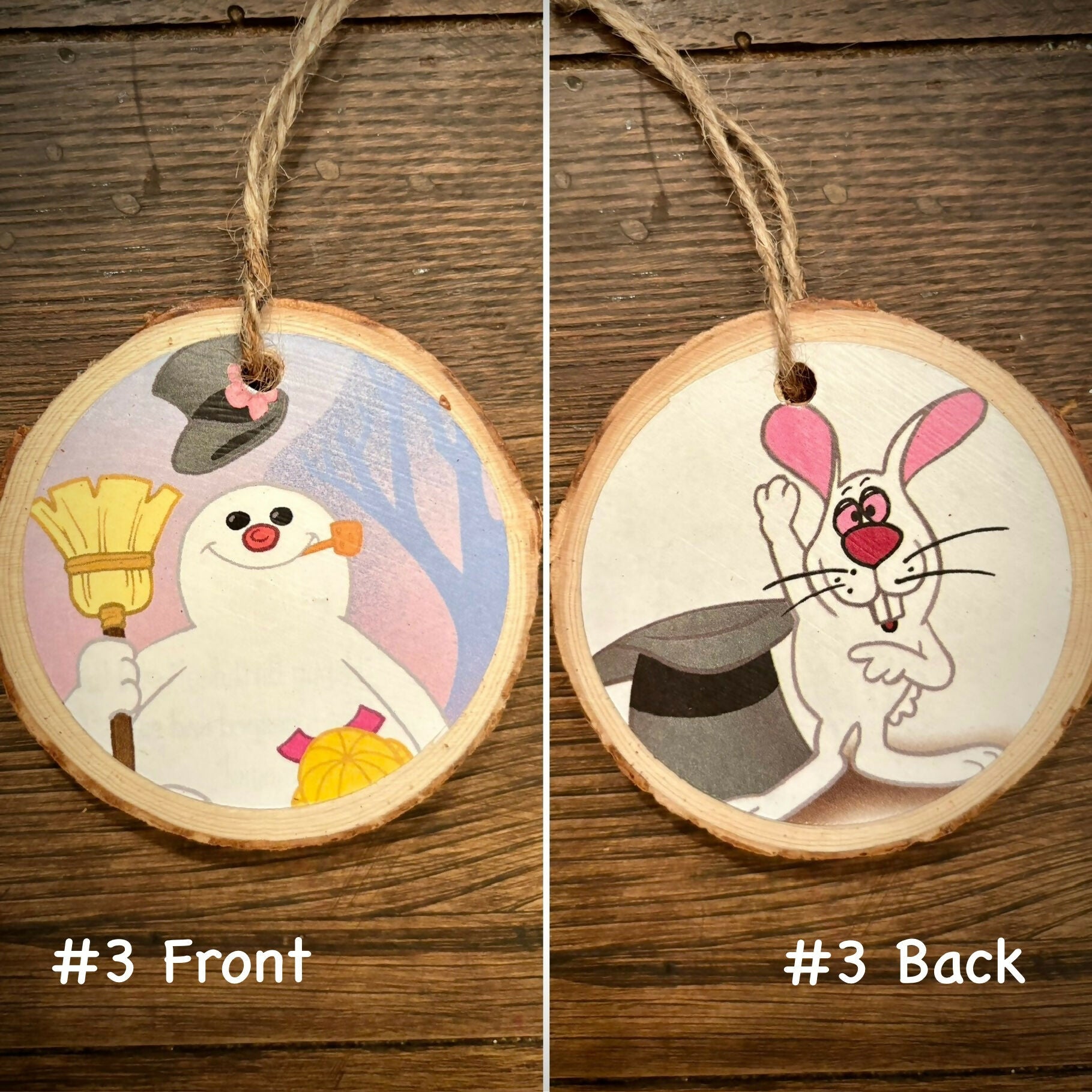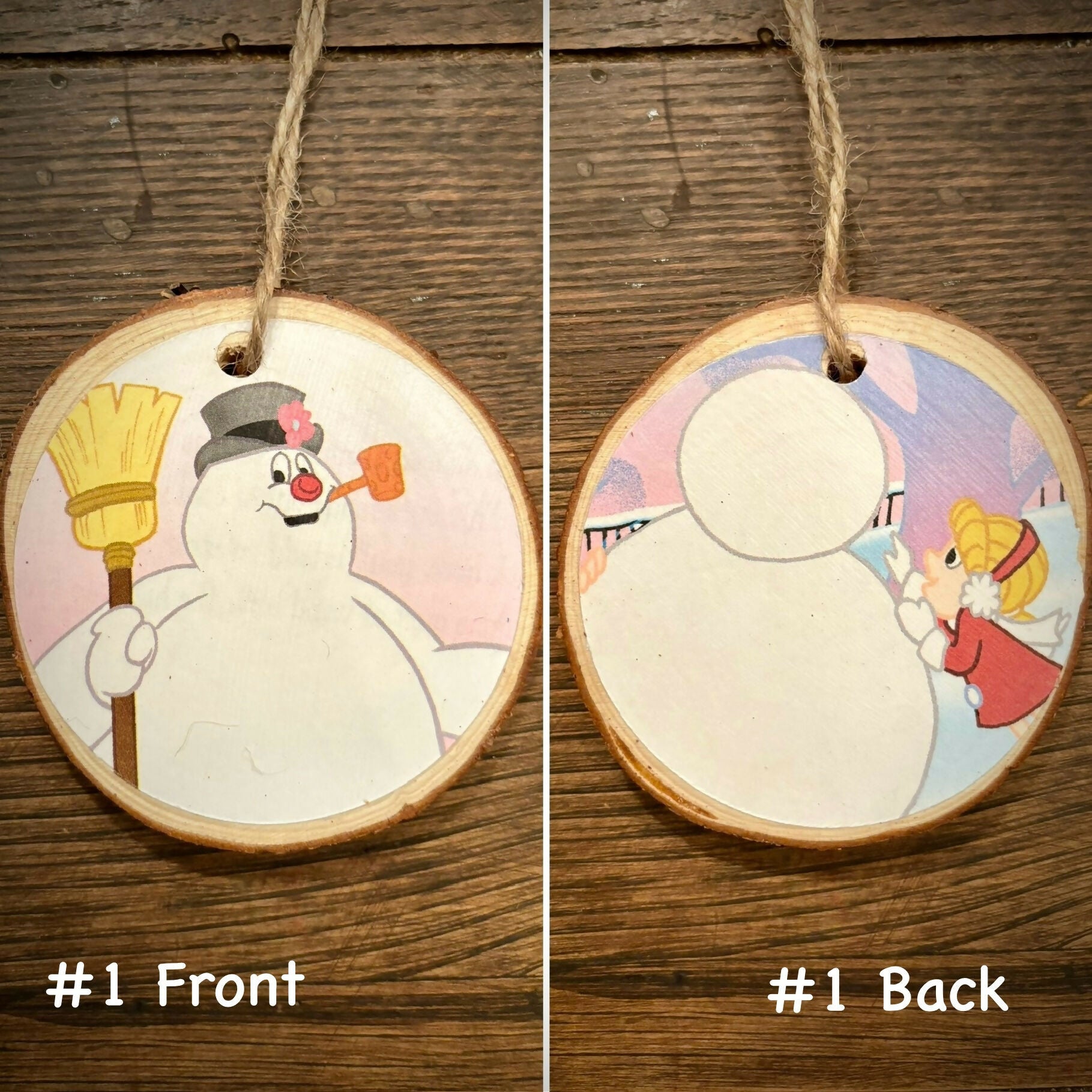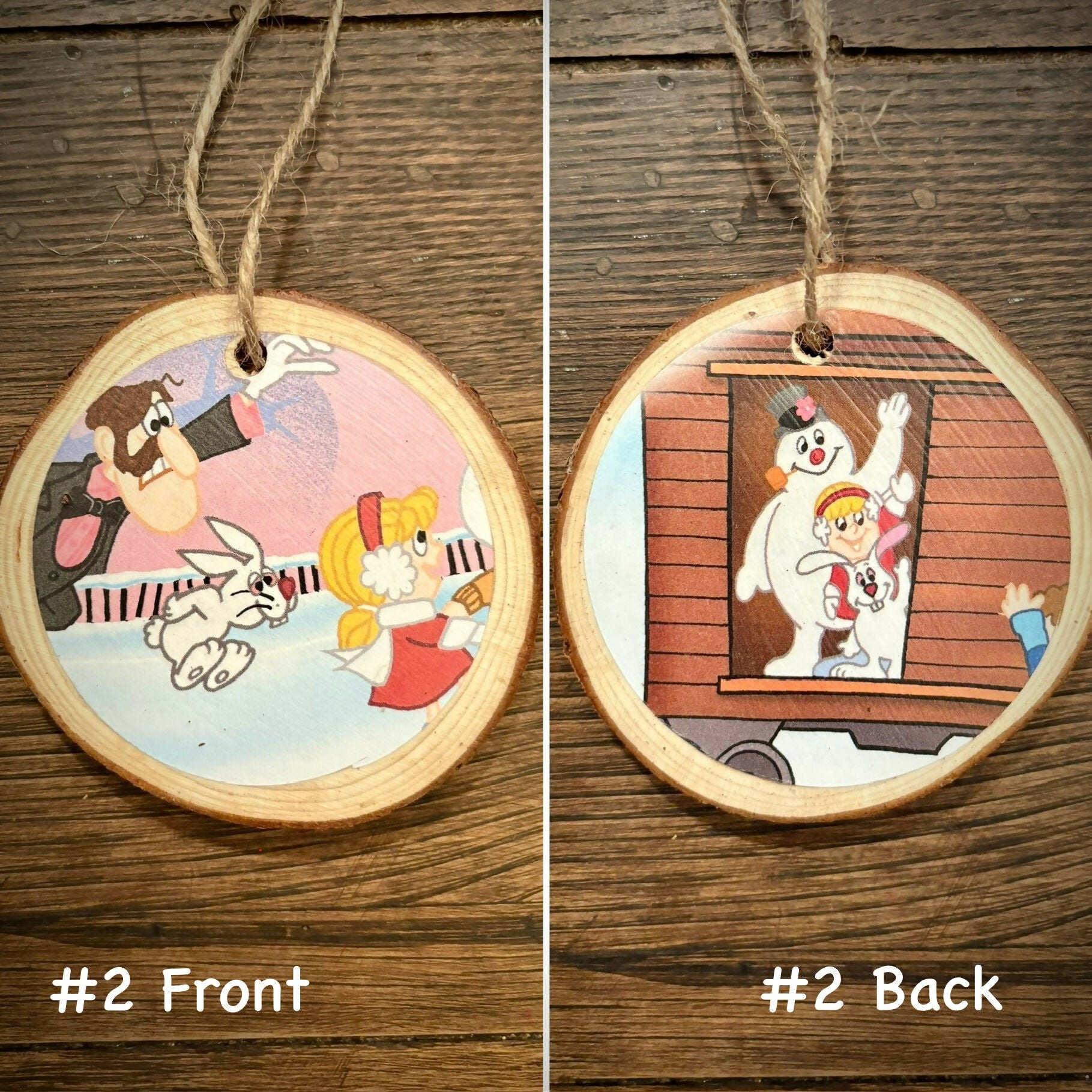 Round wood-cut ornament featuring recycled vintage images from second-hand children’s books. Double-sided with image on front and back (see photos). Each ornament measures approximately 2.5-3” in diameter, on twine string.