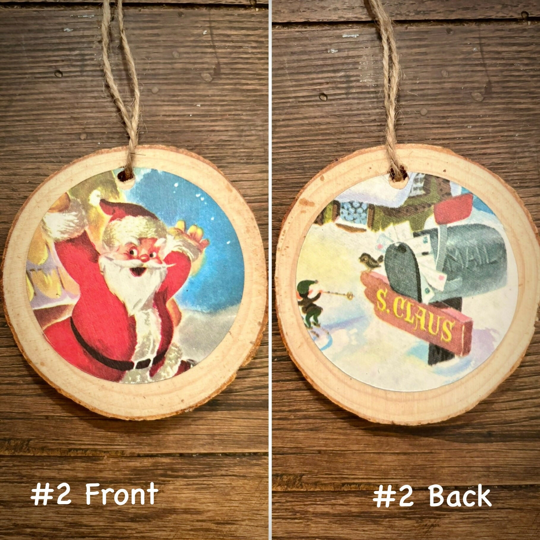 Round wood-cut ornament featuring recycled vintage images from second-hand children’s books. Double-sided with image on front and back (see photos). Each ornament measures approximately 2.5-3” in diameter, on twine string.