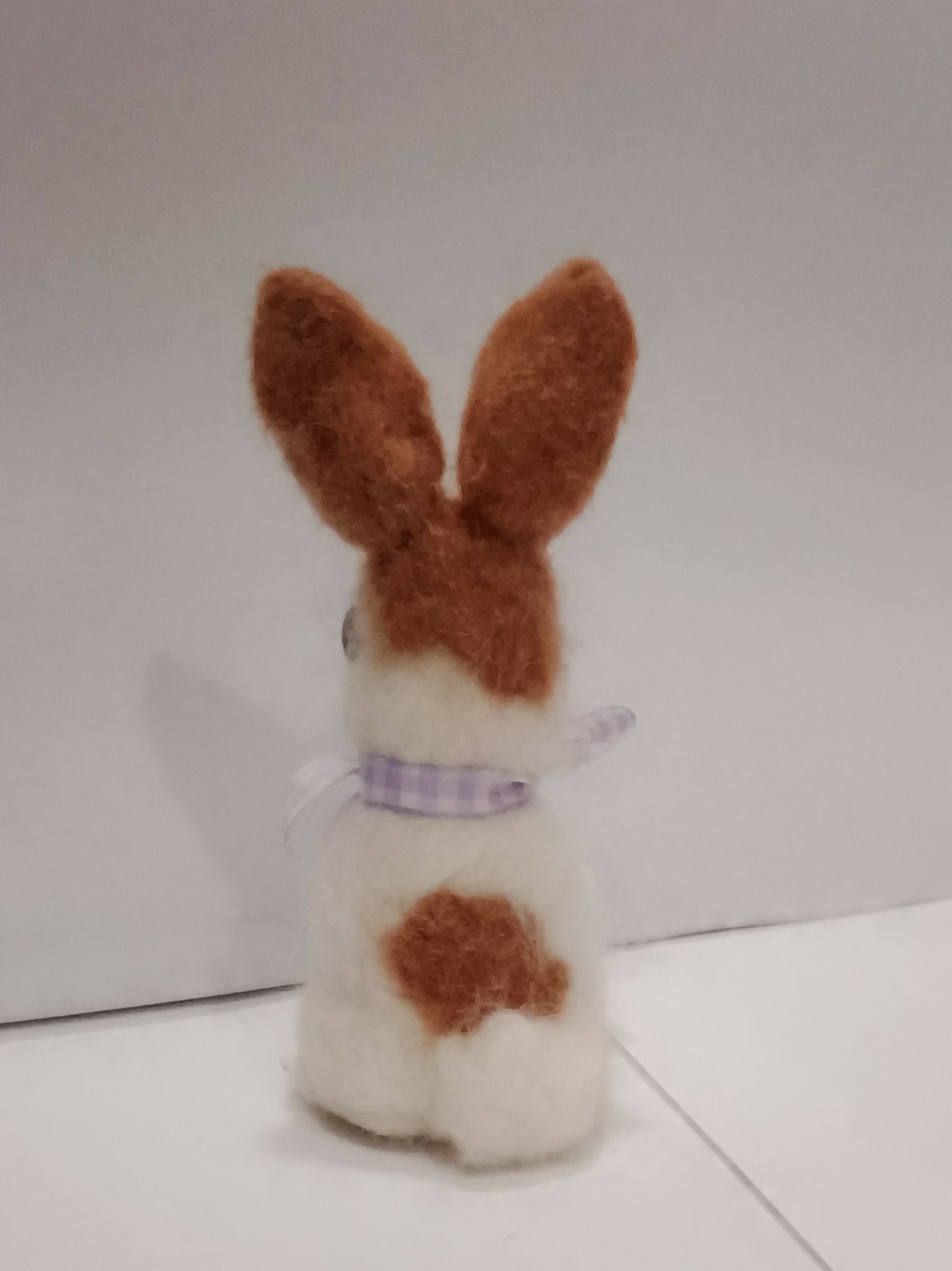 This handcrafted a needle-felted Brown and White bunny with pink inner ears and small dome eyes crafted it also has a purple and white ribbon around its neck. It is from 100% local natural wool using a dry-felting technique. Each piece is unique due to the manual process of repeatedly interlocking wool fibers with a specialized barbed needle to create a dense, solid for a collectible art piece or seasonal (Easter) home decoration . Size: 5 1/2x 2 1/2