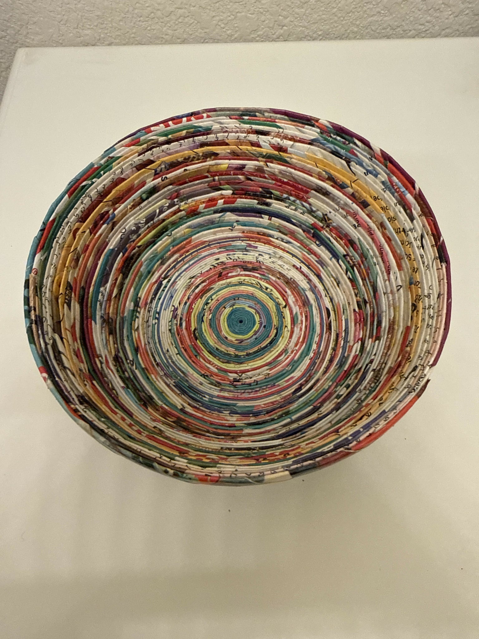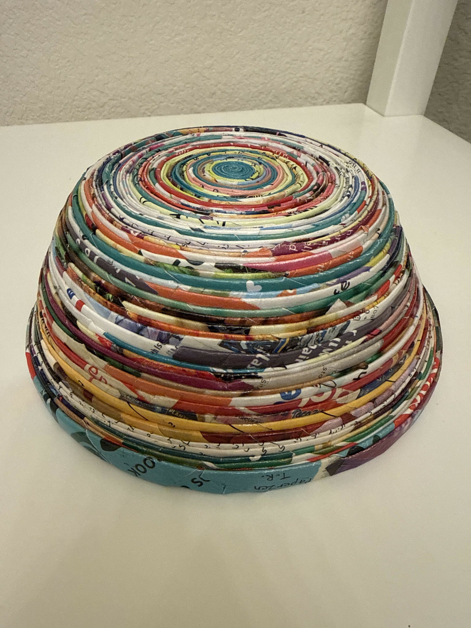 A unique cute tiny storage made out of rolled colorful magazine and newspaper