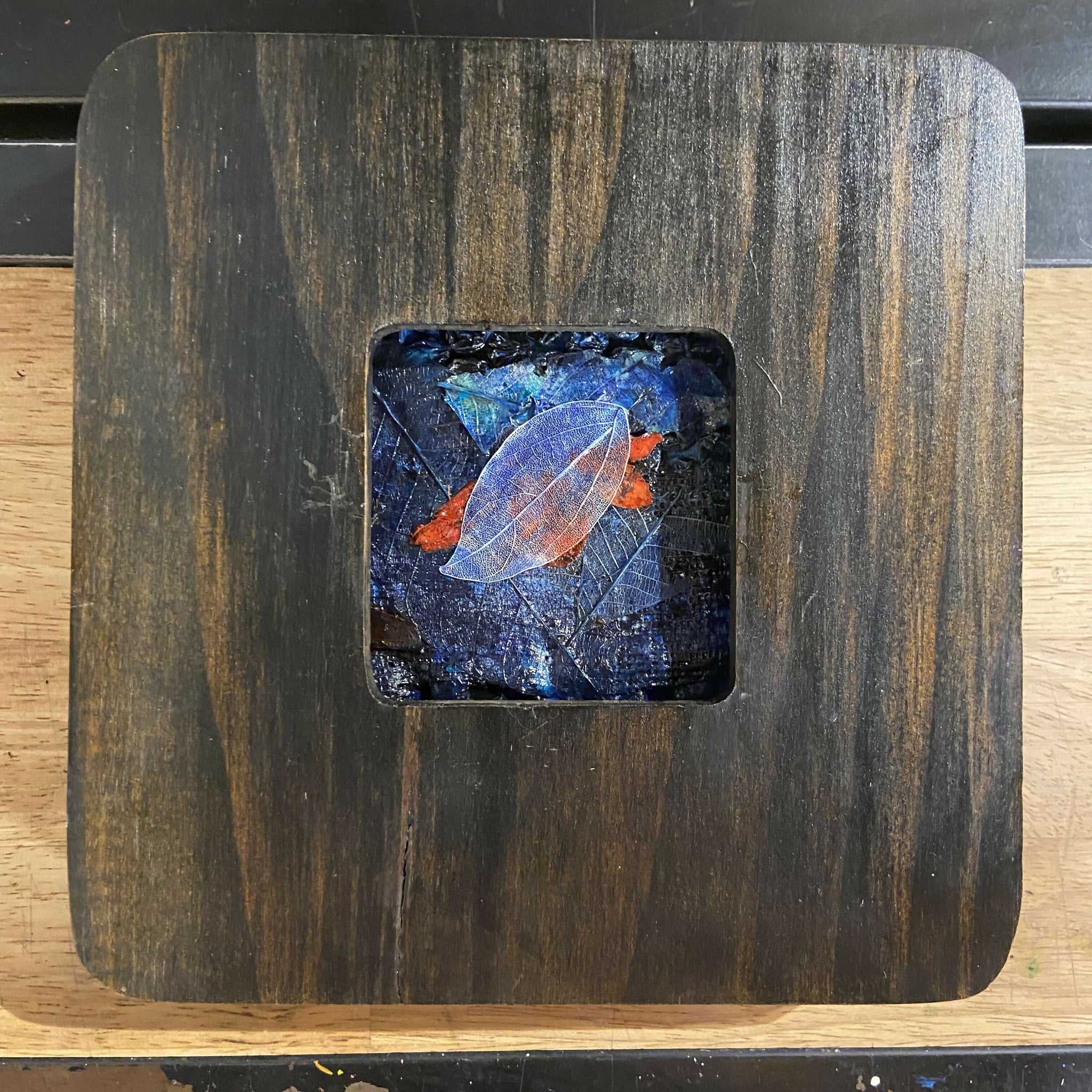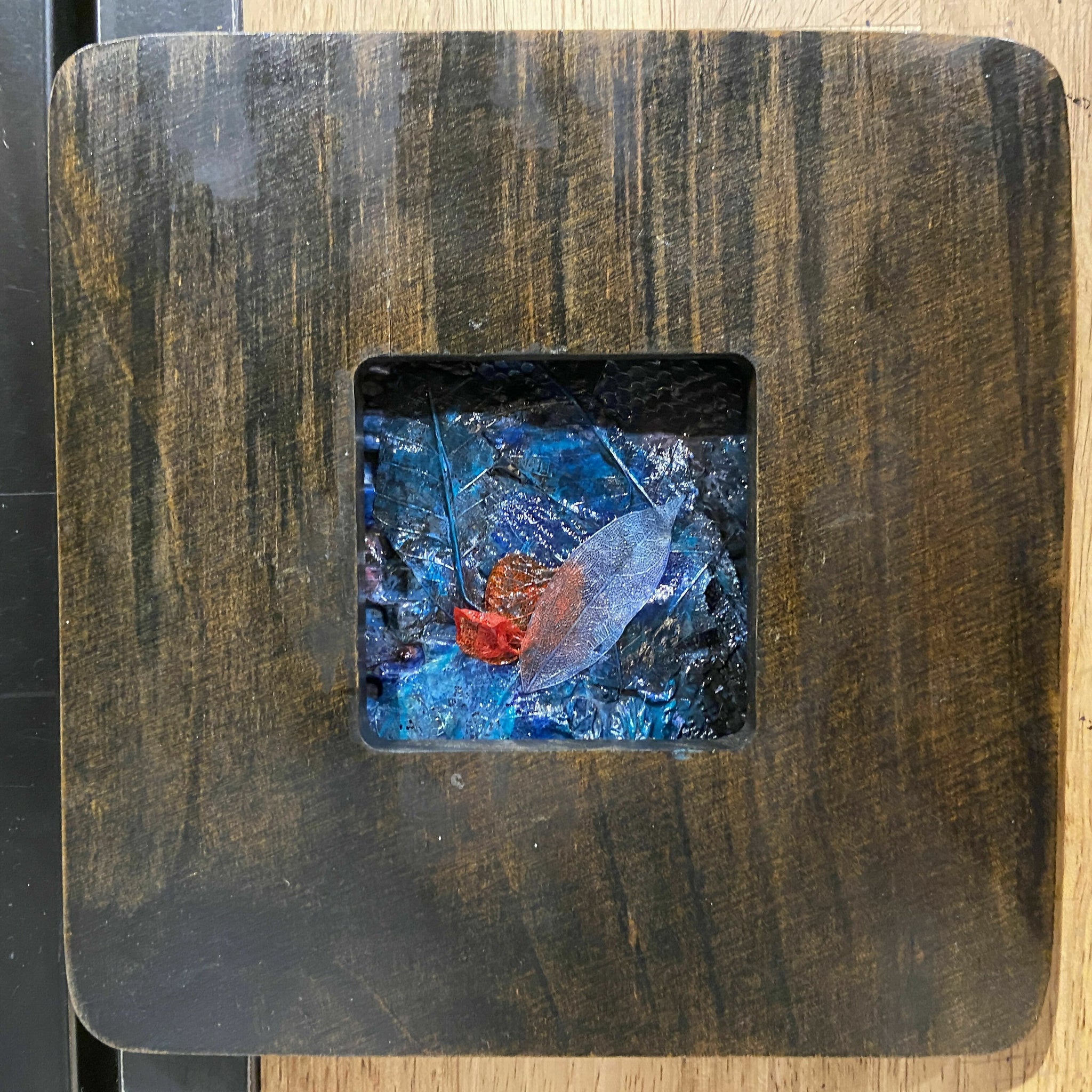 It's a mixed mediums. A local artist put a small blue pond in a frame with peace. Our nature is beautiful with organic, but it contains human mades.