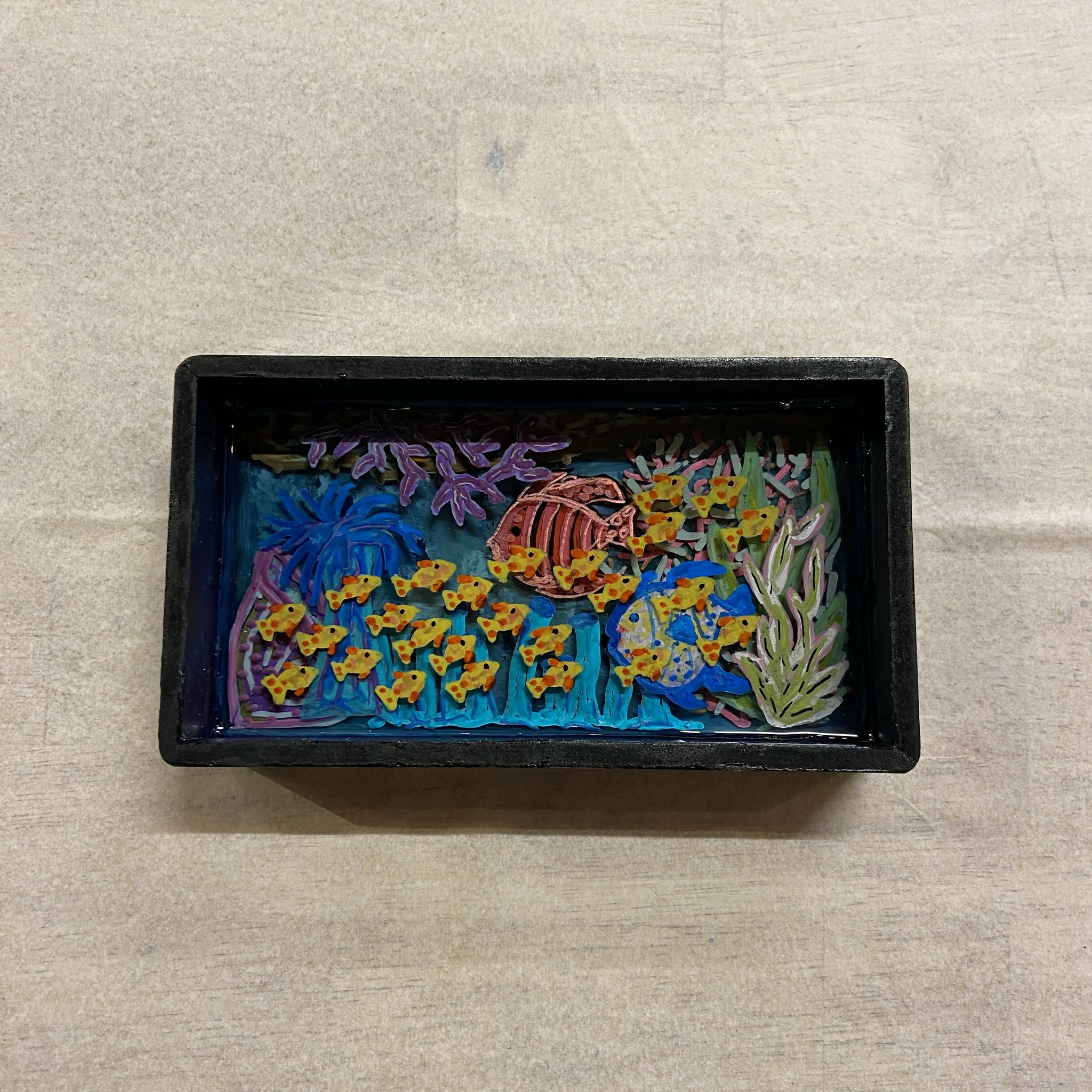 Aquariums painted with acrylic and layered with 5-8 layers of resin creating a 3D appearance. The frame is an 4 x 7 inch box.