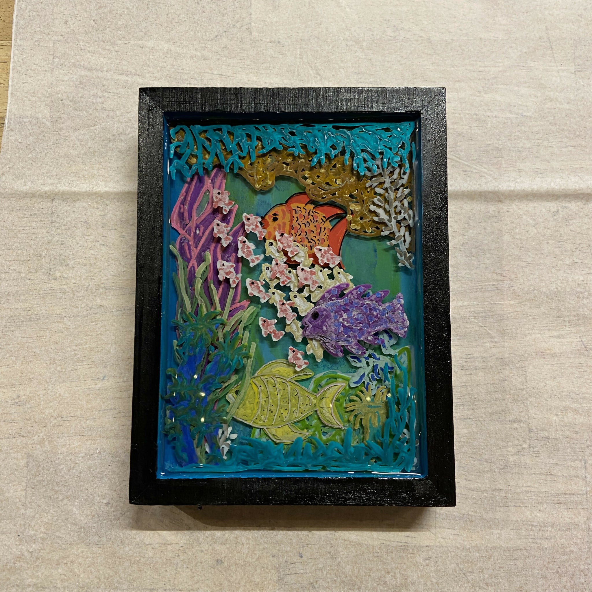 Aquariums painted with acrylic and layered with 5-8 layers of resin creating a 3D appearance. The frame is a 6 x 8 inch box.