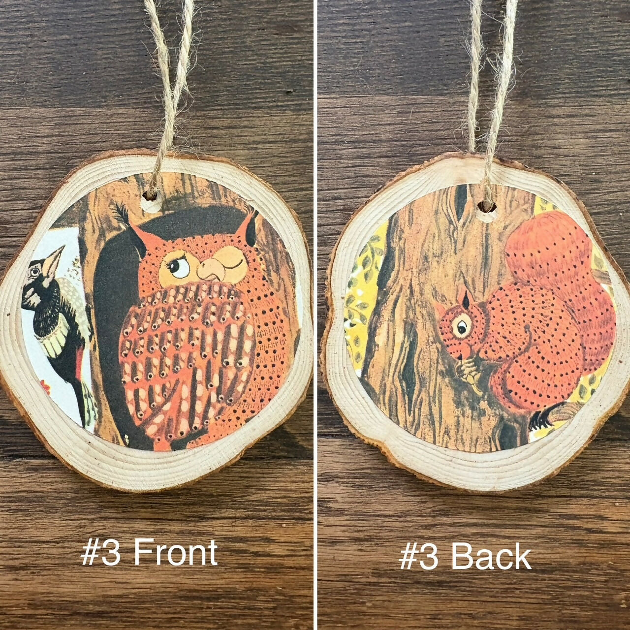 Round wood-cut ornament featuring recycled vintage images from second-hand children’s books. Double-sided with image on front and back (see photos). Each ornament measures approximately 2.5-3” in diameter, on twine string.