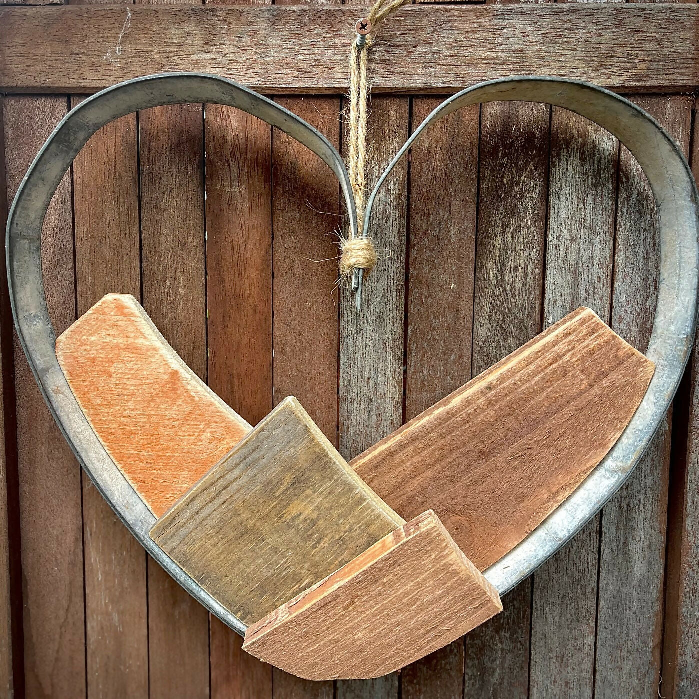 Hand-crafted from recycled materials and inspired by the natural landscape of California. This wall-hanging piece is made from recycled wine barrel straps and reclaimed wood scraps. Measures approximately 13.5"x12". Hand-made in Sacramento, CA.