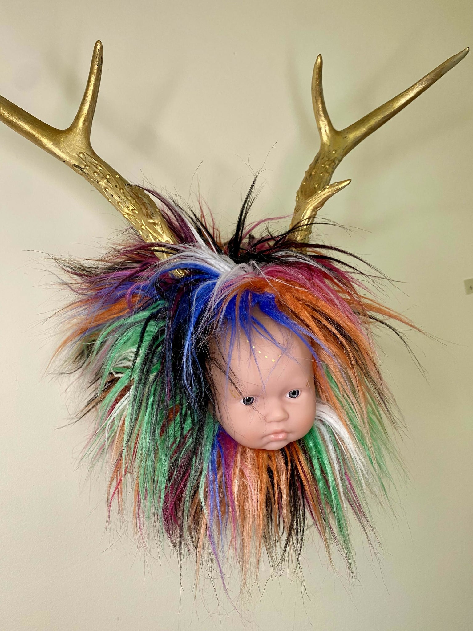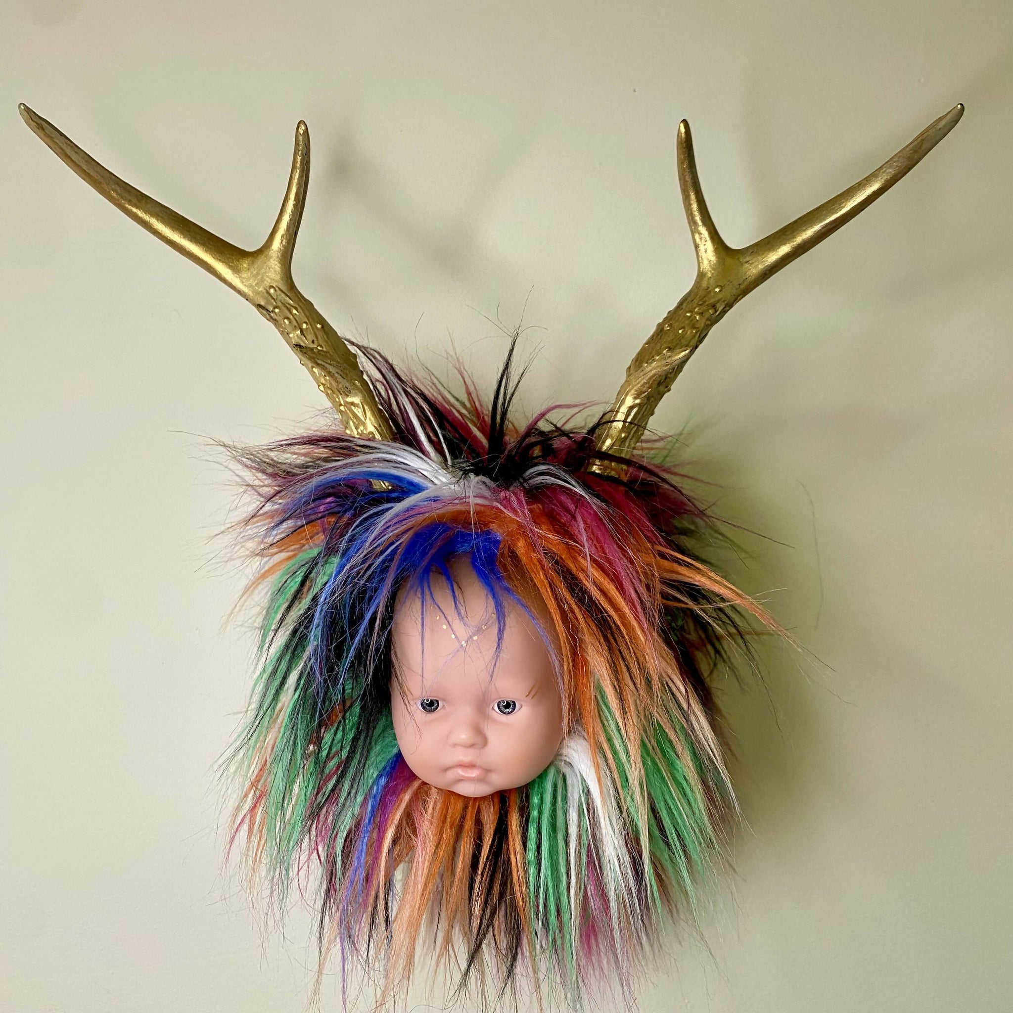 Gilded Glimmerbeast is made from an upcycled babydoll head, found antler components, and scraps of long fur. This wall mounted sculpture measures 12 inches tall, 14 inches wide, and 10 inches deep.